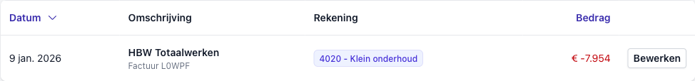 Ga nu terug naar het Overzicht van je boekhouding. Zoek dezelfde transactie van HBW Totaalwerken op. In plaats van "Niet gecategoriseerd" staat er nu "4020 - Klein onderhoud".