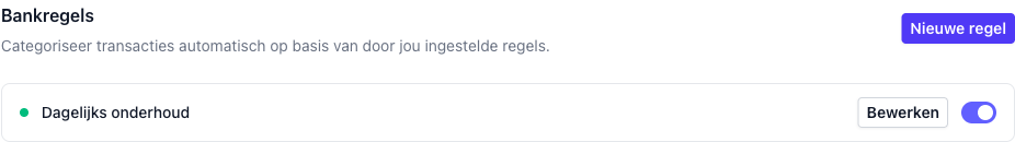 Klik op Bewerken naast de regel in de lijst. Je kunt de naam, actie, rekening en voorwaarden aanpassen. Transacties die al op basis van de oude regel zijn gecategoriseerd, worden niet automatisch bijgewerkt. Die kun je handmatig corrigeren.