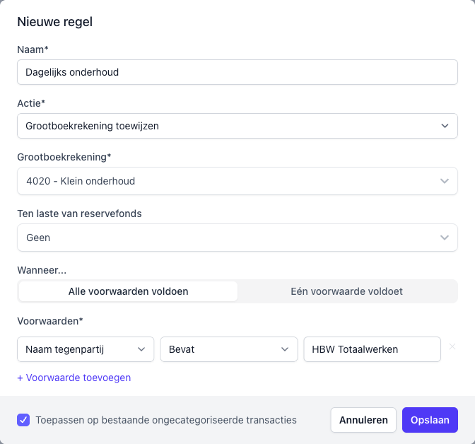 Onderaan het formulier staat een checkbox: Toepassen op bestaande ongecategoriseerde transacties. Als je deze aanvinkt, kijkt Solvve meteen of er al transacties zijn die aan je regel voldoen en categoriseert die ook. Handig als je de regel pas aanmaakt nadat er al transacties zijn binnengekomen.