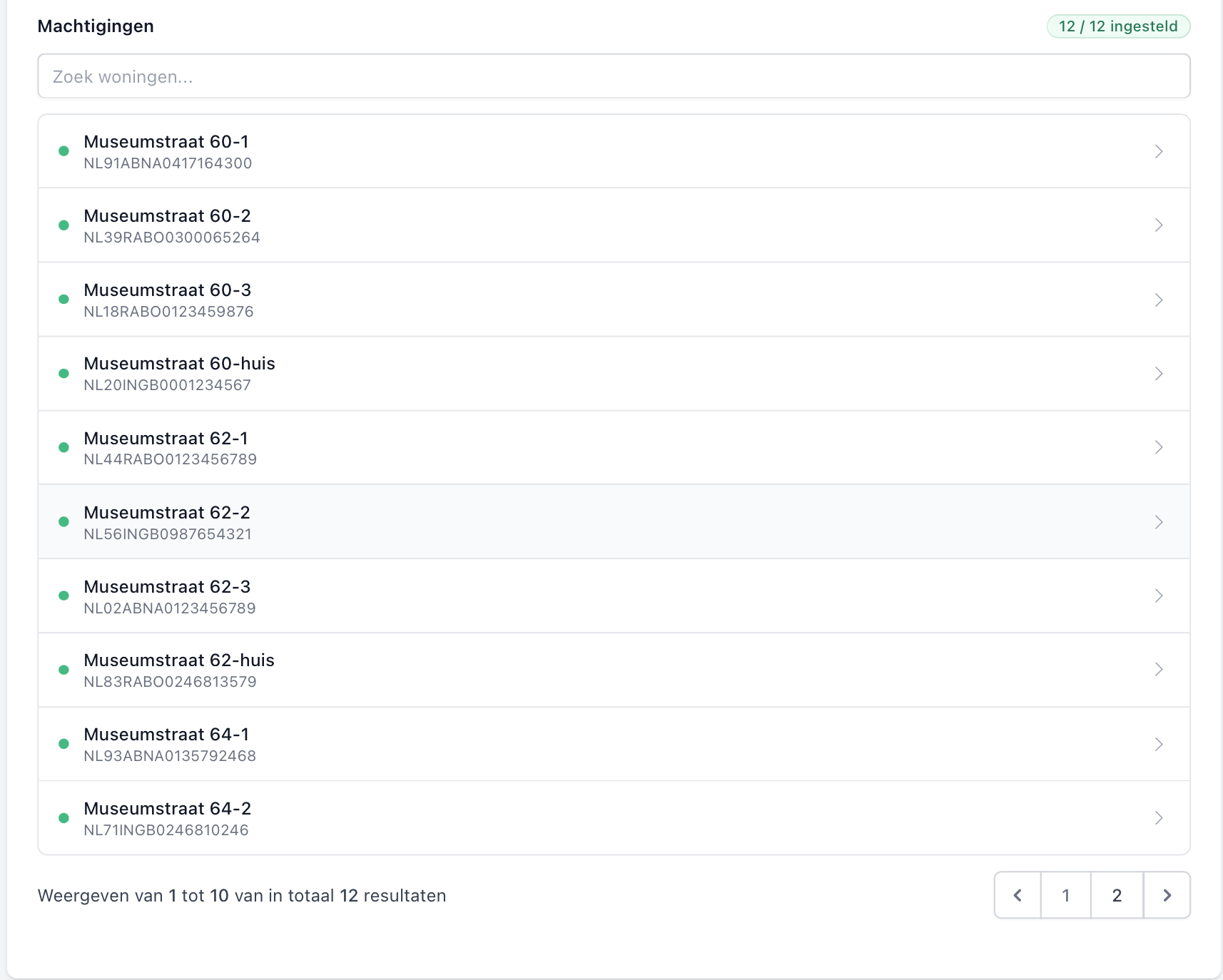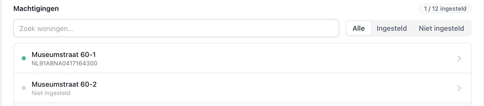 Je kunt de lijst filteren op Alle, Ingesteld of Niet ingesteld om snel te zien welke machtigingen nog ontbreken. Er is ook een zoekbalk waarmee je snel een specifiek appartementsrecht kunt vinden.