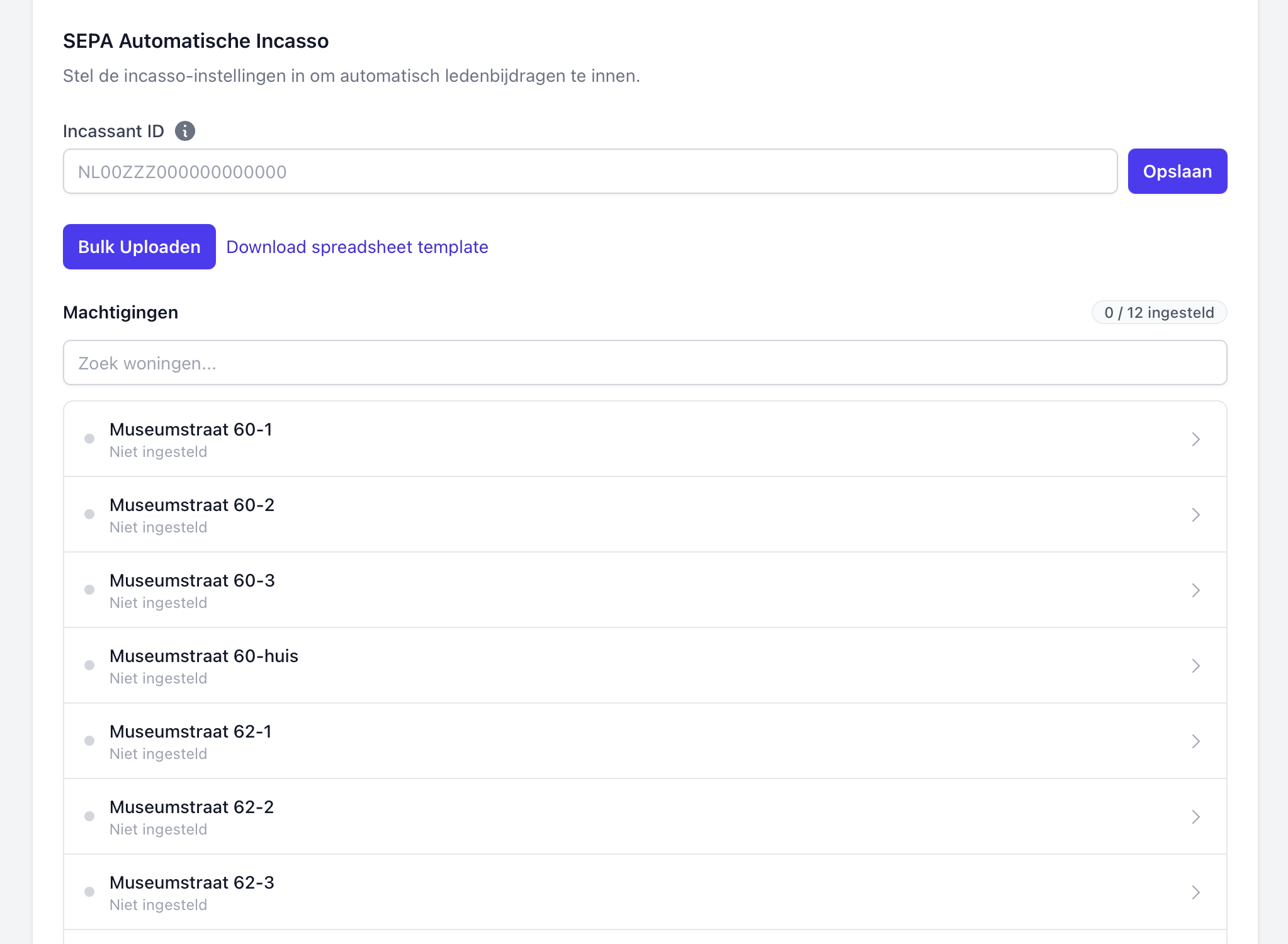 Onder het Incassant ID zie je de lijst met alle appartementsrechten van je VvE. Elk appartementsrecht heeft een machtigingsstatus. In het begin staat overal "Niet ingesteld".