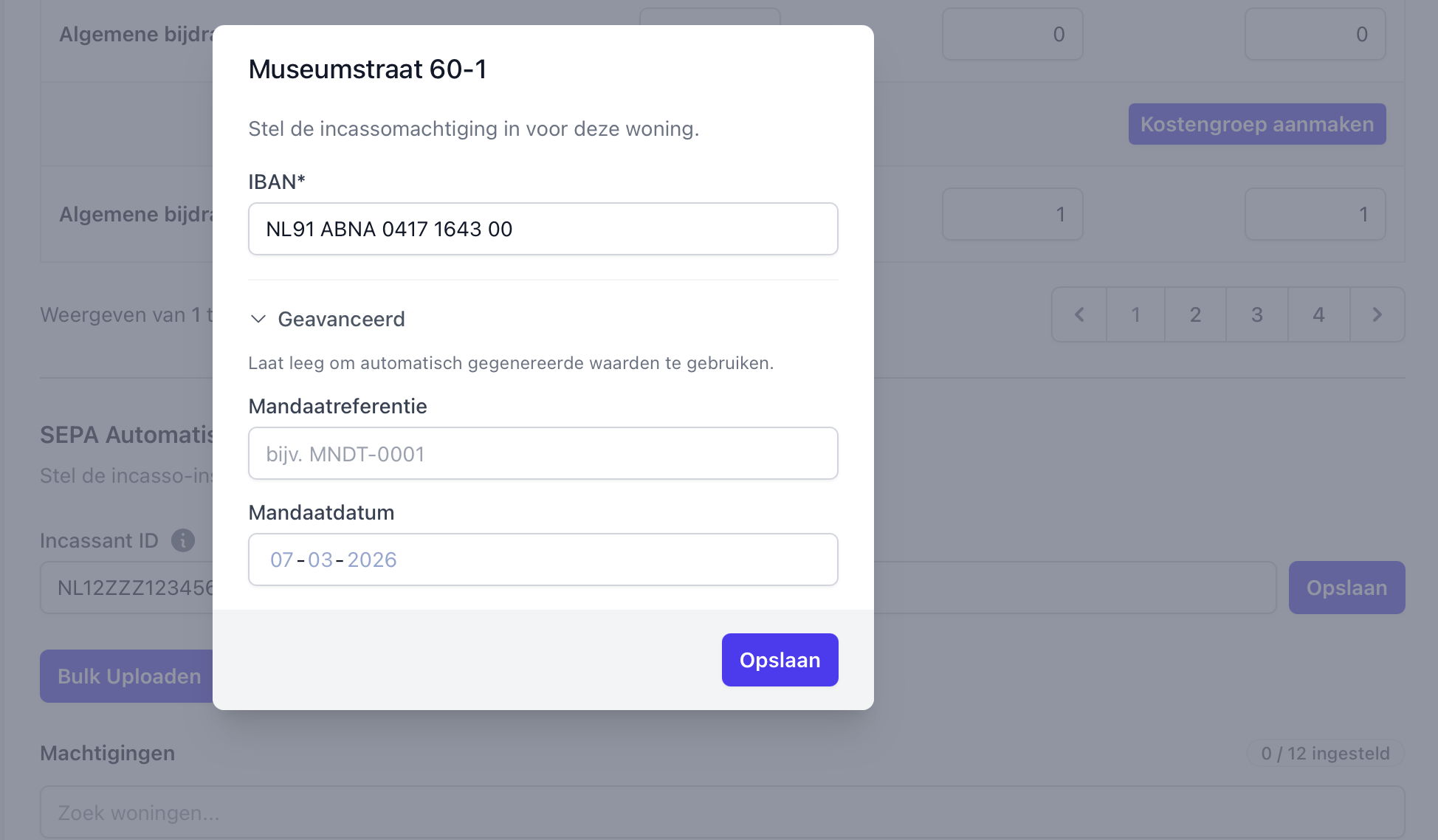 Onder het IBAN-veld staat een Geavanceerd-knop. Als je deze openklapt, kun je een bestaande machtigingsreferentie en -datum invullen. Dit is handig als je VvE eerder al incasso's heeft gedaan via een ander systeem en je de bestaande mandaatgegevens wilt overnemen. Als je deze velden leeg laat, genereert Solvve automatisch een referentie en wordt de datum van vandaag gebruikt.