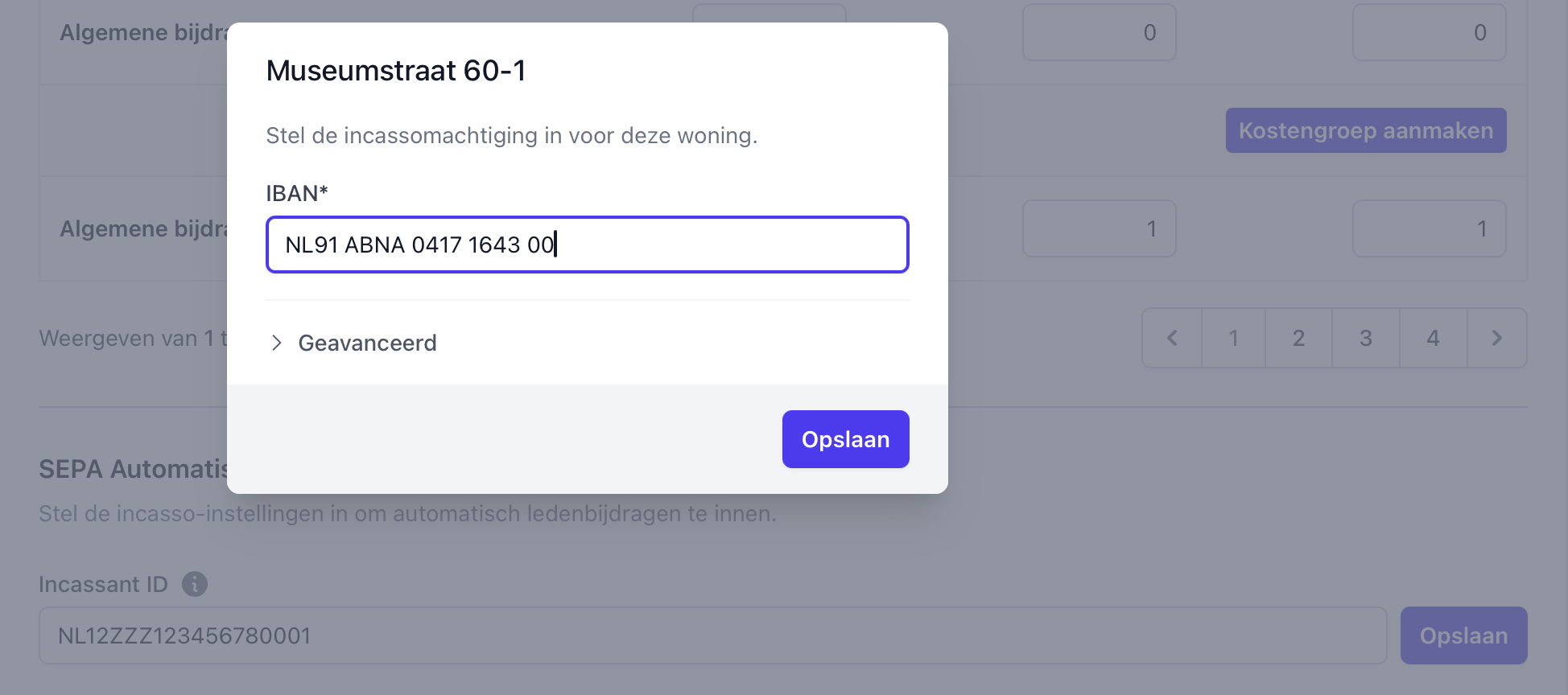 Vul de IBAN in van de eigenaar die bij dit appartement hoort en klik op Opslaan.