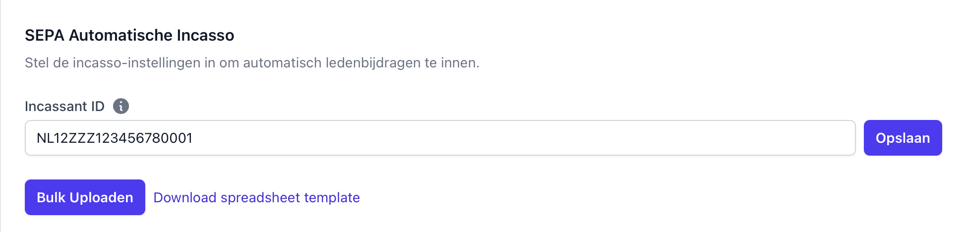 Vul je Incassant ID in het tekstveld in en klik op Opslaan. Het ID heeft het format NL00ZZZ000000000000. Je bank verstrekt dit nummer.
