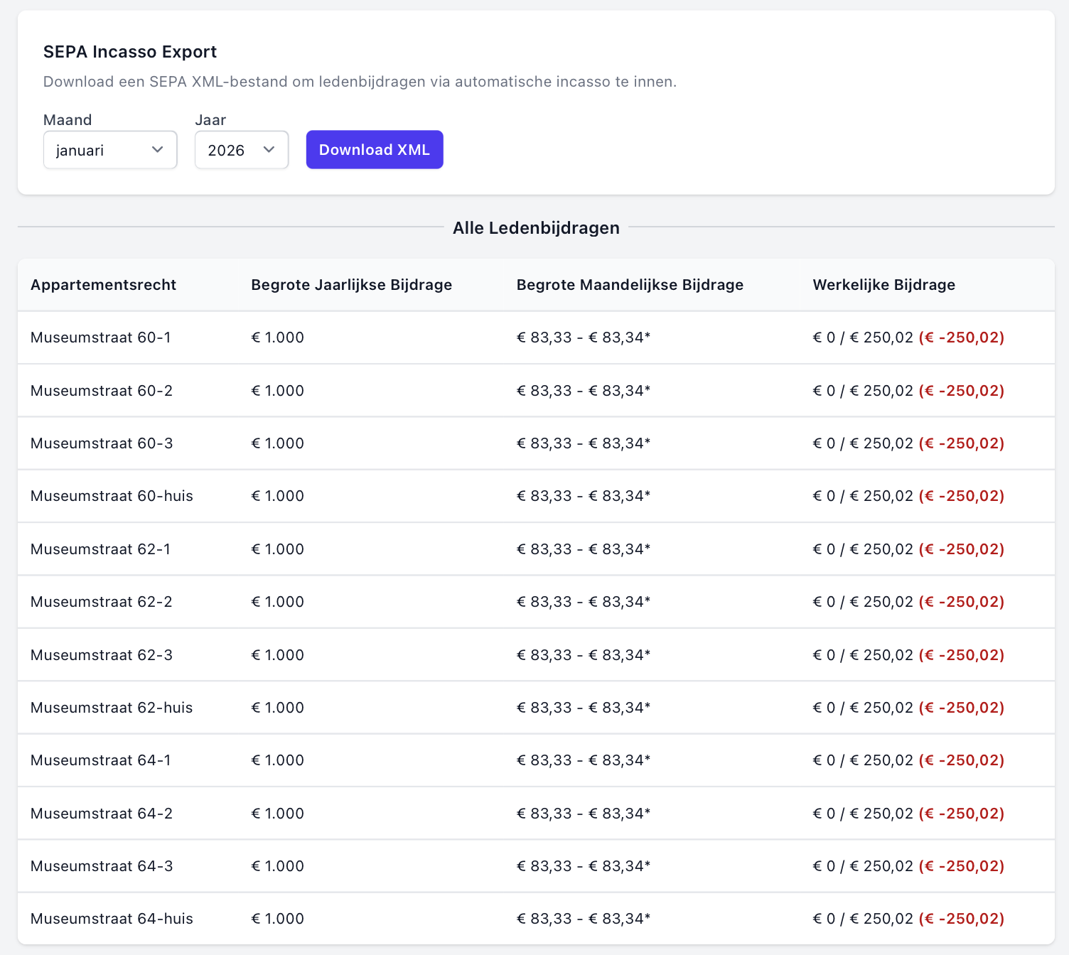 Controleer de begroting. De maandelijkse bijdragen worden berekend op basis van de goedgekeurde begroting. Zorg dat deze actueel en definitief is voordat je incassobestanden gaat downloaden.