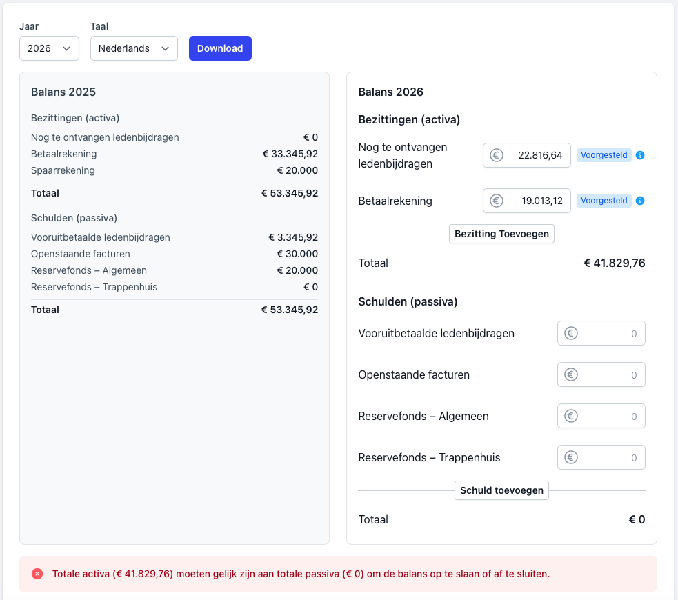 De balans moet altijd in evenwicht zijn omdat elke bezitting gefinancierd is door een verplichting (zoals een reservefonds) of een schuld. Het totaalbedrag onderaan beide kolommen moet dus identiek zijn.