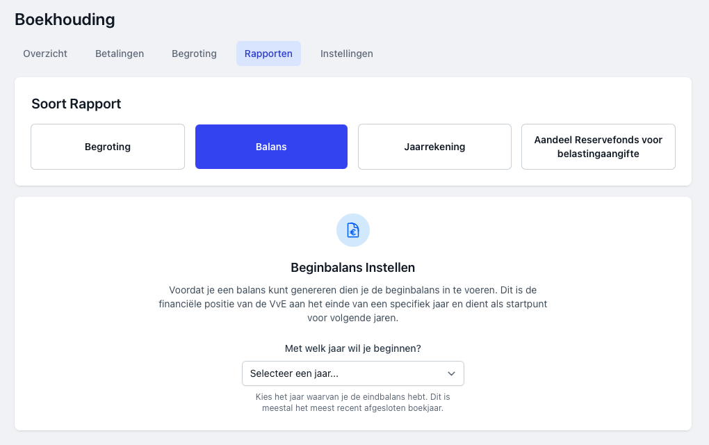 Je begint met het invullen van de beginbalans. Dit zijn de eindcijfers van het voorgaande jaar, zodat de boekhouding met de juiste startwaarden verdergaat.